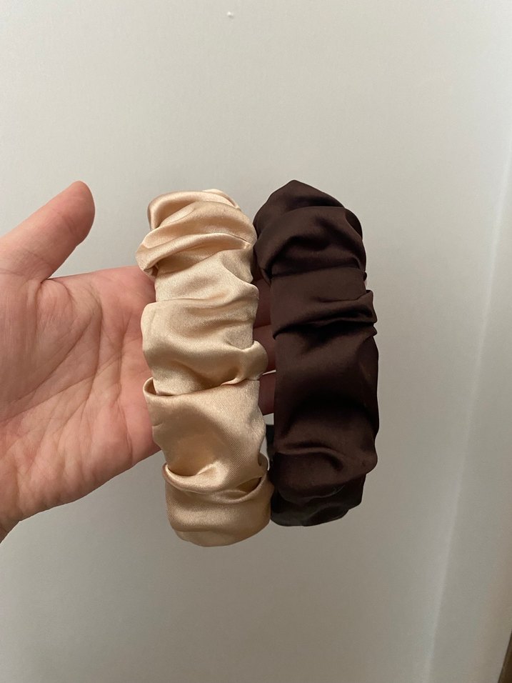 İpek görünümlü bej ve koyu kahverengi, lastikli saç bantları. Paris tarzı karşı kültür stilini yansıtır.✨