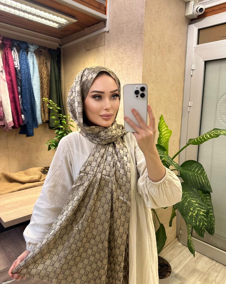 ipek görünümlü, drapeli şal. Mütevazı ve bohem sokak stili için uygundur.