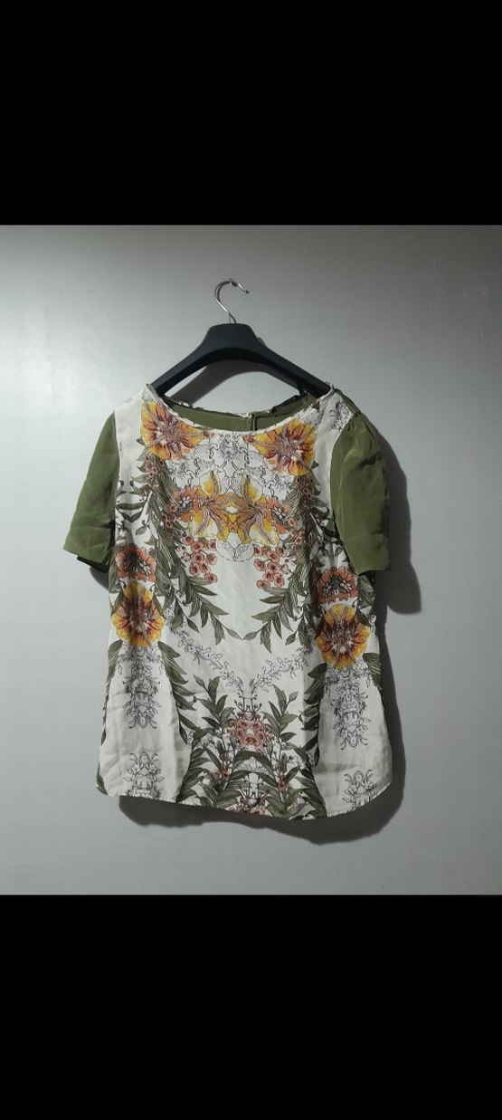 Kısa kollu, yuvarlak yakalı, bol kesim bluz, canlı çiçek desenli ve drapeli tasarıma sahiptir. Yeşil ve gri tonlarıyla bohem tarzı yansıtır.