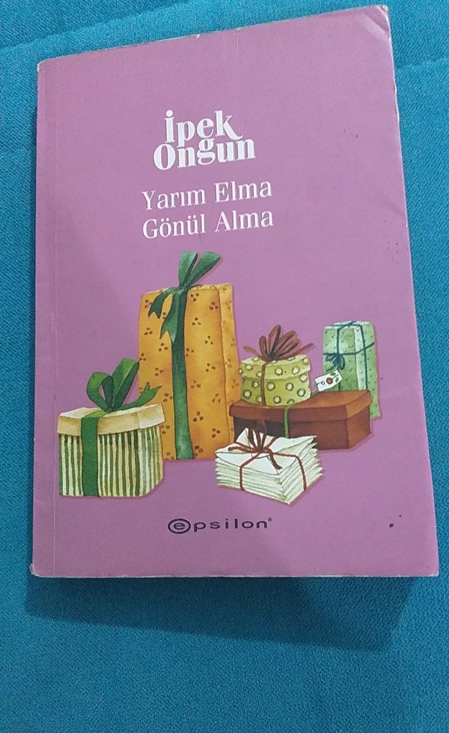 İpek Ongun'un "Yarım Elma Gönül Alma" romanı, Epsilon yayınevi tarafından basılmış, pastel renkli kapakta hediye kutuları illüstrasyonu bulunuyor.