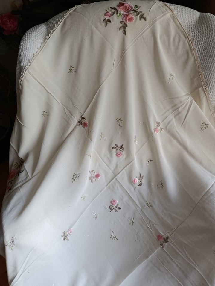 İpek üzerine Nakışlı, pastel renkli çiçek desenlerine sahip beyaz masa örtüsü. Geleneksel tasarımı ve ince detaylarıyla sofranıza zarif bir dokunuş katıyor. Hiç kullanılmadı 110*106.2adet var .adet fiatı 1500tl