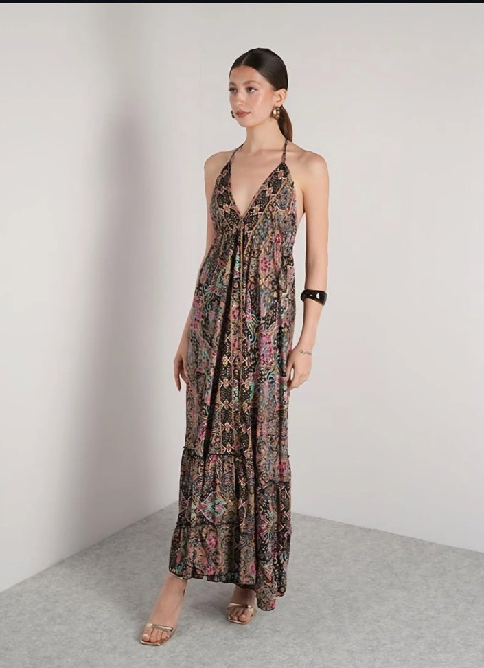 ipek kumaştan desenli sırt dekolteli harika bir elbise