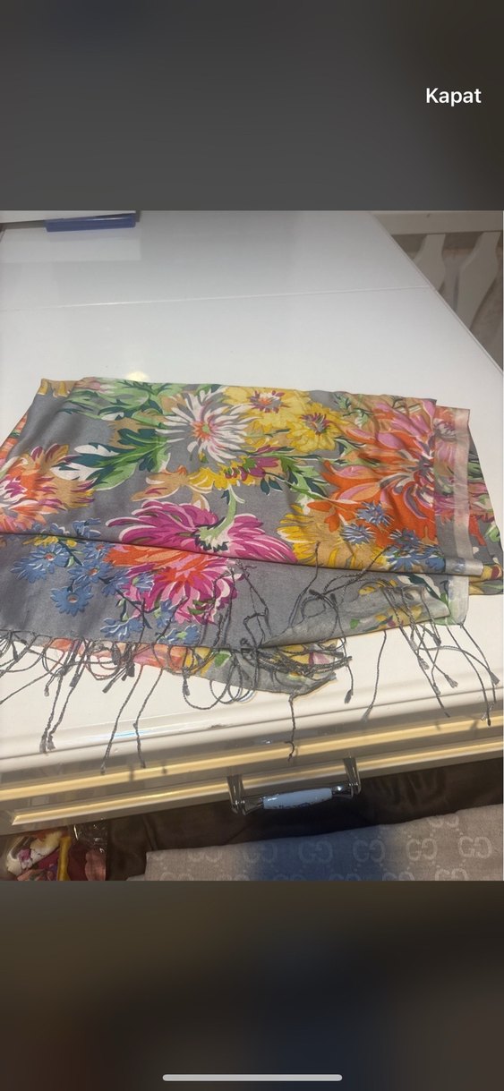 Yumuşak gri sentetik kumaş üzerinde canlı çok renkli çiçek desenli, drapeli bohem kadın şal adet fiyatı