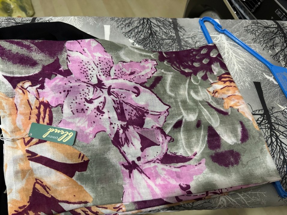 Mor ve gri tonlarda, yumuşak sentetik kumaştan bohem tarzda, drapeli kadın şalı.