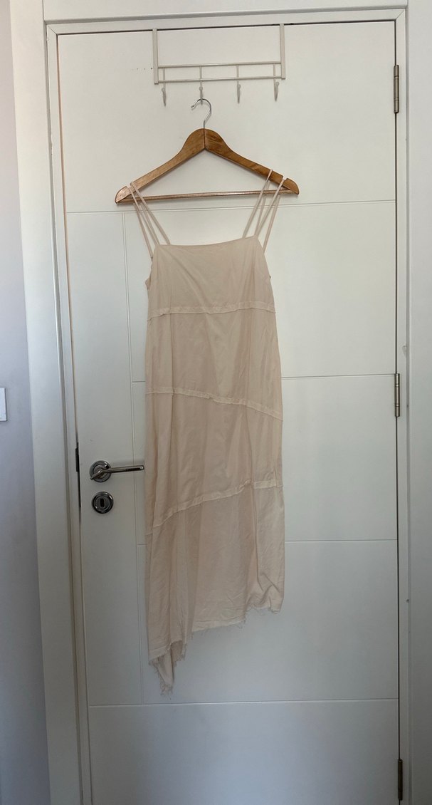34 beden, Bej renkli, ince askılı ve bol kesimli keten kumaştan uzun elbise. İki ipli düz yakaya sahip, drapeli detaylarla minimalist bohem tarzda. Asimetrik kesimde. Ceplidir. Nikah çekiminde giymiştim. 1 kez giydim. Salaş bir tarzı var.