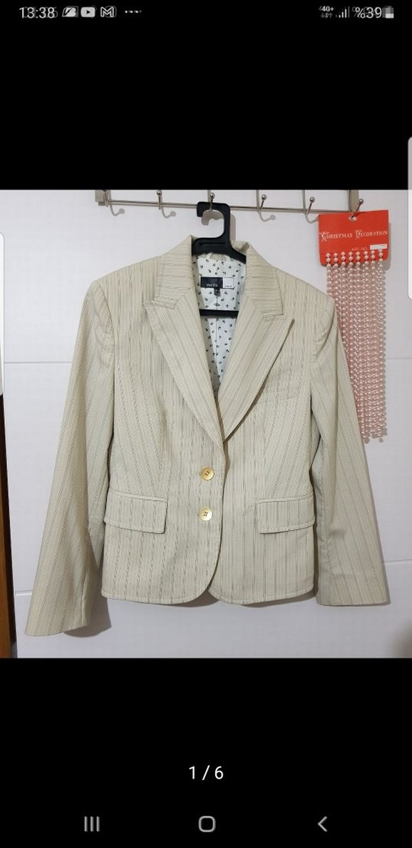 Bej pamuk kumaştan, düğmeli ve kesimli yakalı kadın blazer ceket. Normal kesim, uzun kollu ve hafif zebra desenlidir, iş ve günlük kullanım için uygundur. pantolonunda dolapda dururken bir nokta oluşmuş ceket alan isterse çok cüzi ücrete onu da göndereceğim