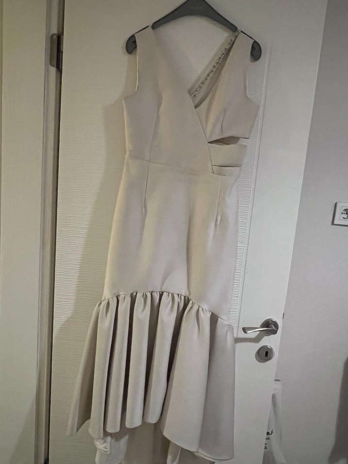 İpekyol Abiye 38standart kalıptır Bej renkte, V yaka ve kolsuz, drapeli detaylara sahip uzun abiye elbise. Fitted kesimi ve modern tarzıyla düğünler için uygun. ✨