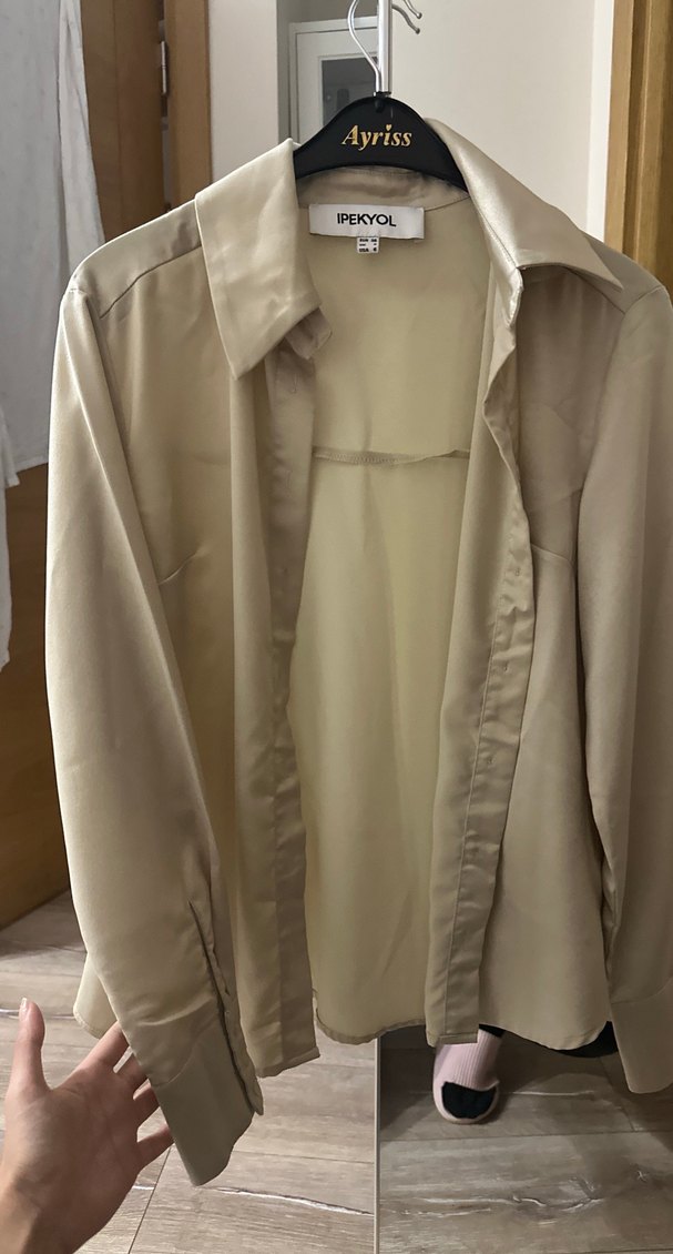 IPEKYOL markalı, düğmeli, bej renkli, uzun kollu kadın gömlek. Normal boyda, regular fit ve satenimsi dokuda, ofis için uygun sade tasarım.