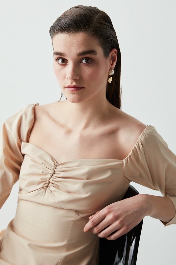 İpekyol bej kalp yaka elbise yüzde yüz pamuk kumaş