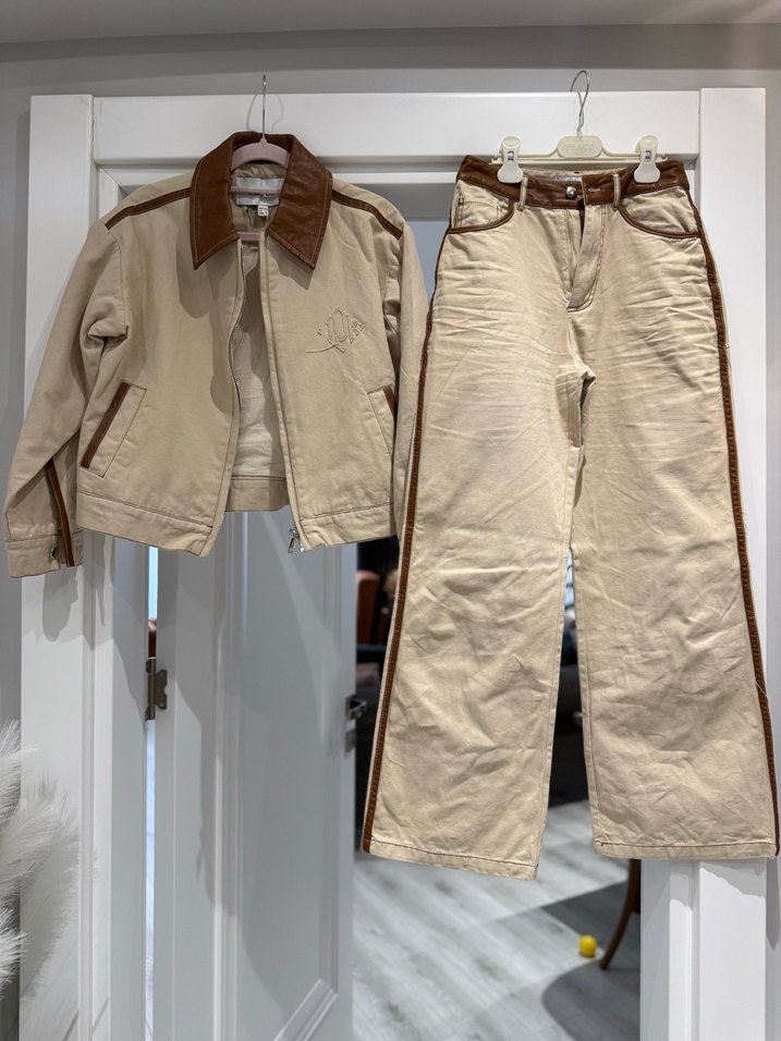 Bej renkli deri detaylı takım , regular fit ve kemerli tasarıma sahip. Denim kumaş yaka bel kısımlarında deri detayları var hiçbir kusuru yoktur