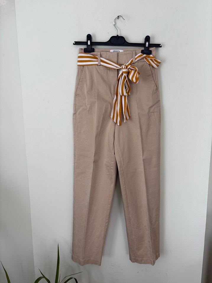 İpekyol Marka Bej renkli, çizgili kemerli, pamuklu kadın pantolon. Yüksek bel kesim ve midi boyda, ofis ve günlük sokak stiline uygundur. İade kabul edilmeyeceği için ürün hakkında ayrıntılı bilgi sorunuz. #ipekyol #mango #zara #beymen #vakko #indirim #pantolon #bejpantolon