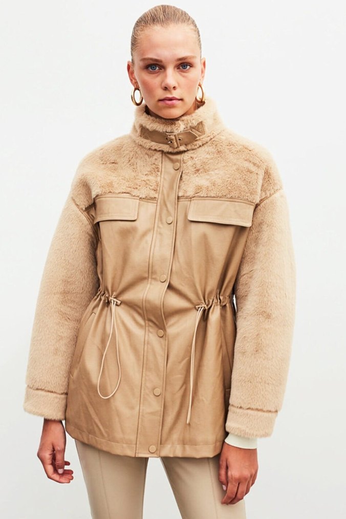 Kürklü ve deri detaylı kısa boy bej kadın mont, bol kesim ve uzun kollu. Notch yaka ve belde bağcık içerir, rahat ve şık bir sokak stili sunar. Temizdir aslında çok kullanmadım ama bir kere giydiğimde tırnağım bir cebimin kenarını biraz deforme etmişti foto atarım isteyene ayrıntılı 5-6 bine eklemişler ben minik de olsa deforme olduğundan uyguna ekliyorum