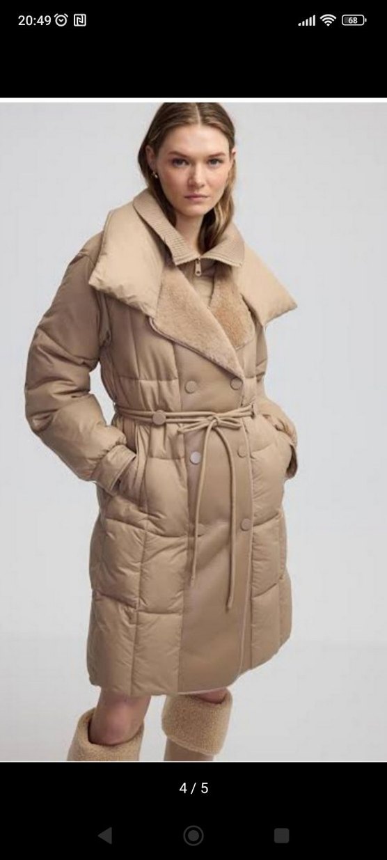 Bej uzun kadın mont, kürklü yakası ve askılı kolları ile dikkat çeker. Rahat kesim ve bağlamalı bel detayıyla konfor sağlar. Sokak stiline uygun, desensiz tasarım.