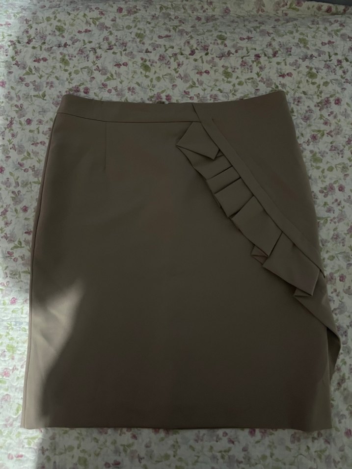 Bej renkli, yan kısmında volan detayı bulunan midi boy regular fit etek. Düz, iş ve sokak stili için uygun sentetik kumaştan yapılmıştır. Hiç kullanılmadı