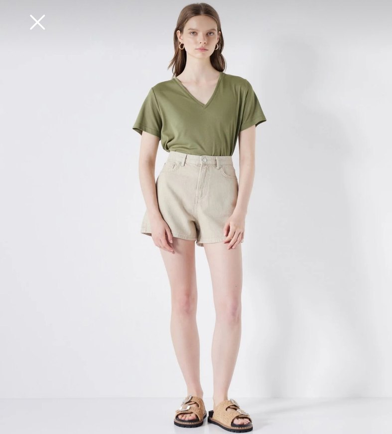 Bej renkli kumaştan, yüksek bel ve bol kesim kısa şort, günlük rahat kullanım için uygundur.