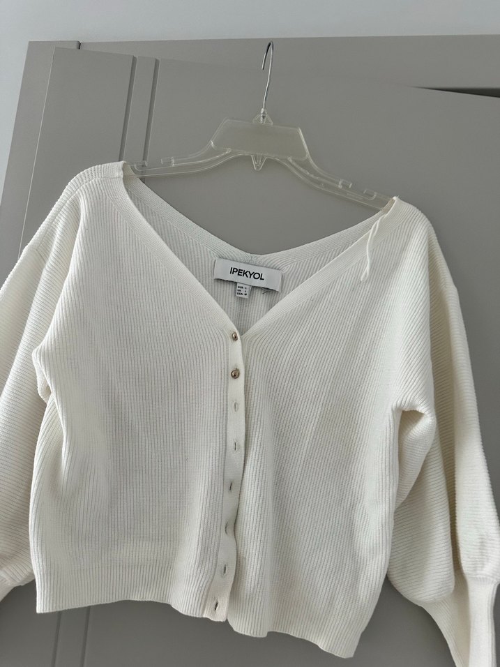 IPEKYOL markalı beyaz metal düğmeli v kesim sırt ve ön yaka. Kısa ofis ve sokak stiline uygun.