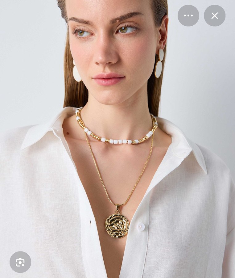 Orta uzunlukta beyaz renkli, zincir detaylı ve gold desenlere sahip kolye, gündelik kullanıma uygun minimal ve şık tarzda.