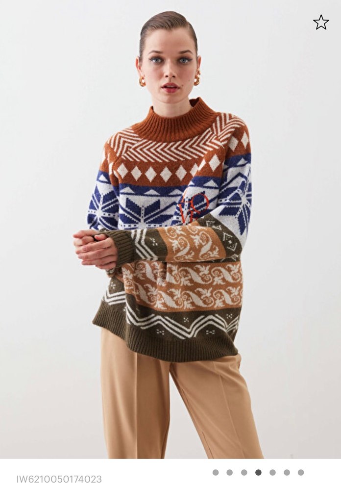 Bohem tarzı, kahverengi, desenli örgü triko kazak. Boğazlı yaka, uzun kollu, bol kesim ve hafif uzun boyda, günlük kullanım için uygun. Yün ve pamukludur hafif tüylenmesi vardır