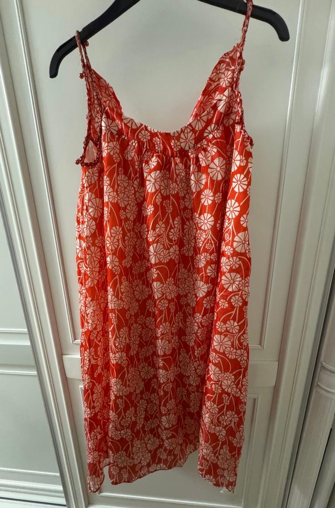 Kırmızı bağlama desenli, askısız ve bol kesim bohem midi elbise, günlük kullanım için uygundur.