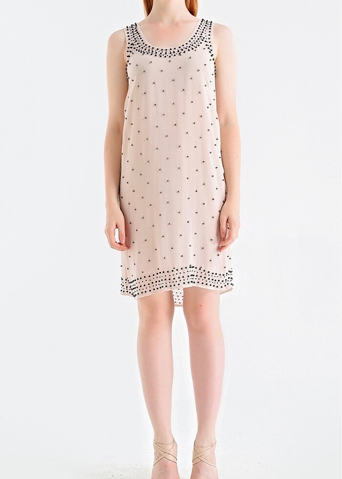 Tertemiz durumdadır Kenar boncukları siyah orta boncukları gri aynalıdır Çok boncuğu var illaki dökülen olmuştur Farkedilen bir eksik yok İnce bir elbisedir Astarlıdır Fermuar vs yoktur Bütün bir elbisedir
