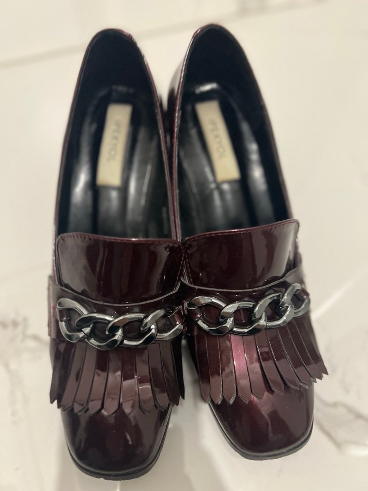 Bordo renkte, parlak deri klasik ayakkabılar blok topuklu, yılan deseni ve zincir detaylıdır, iş ortamı için uygundur. geniş kalıp 38 numara ancak 38,5 giyen için uygundur