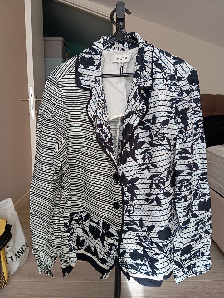 Düğmeli, notç yaka ve uzun kollu kadın ceketi, iki farklı koyu renkli desenli kumaşla tasarlanmıştır. Normal kesim ve midi boyuyla günlük sokak modasına uygundur. Koltuk altı ölçüsü 63 Boy 75 cm dir.