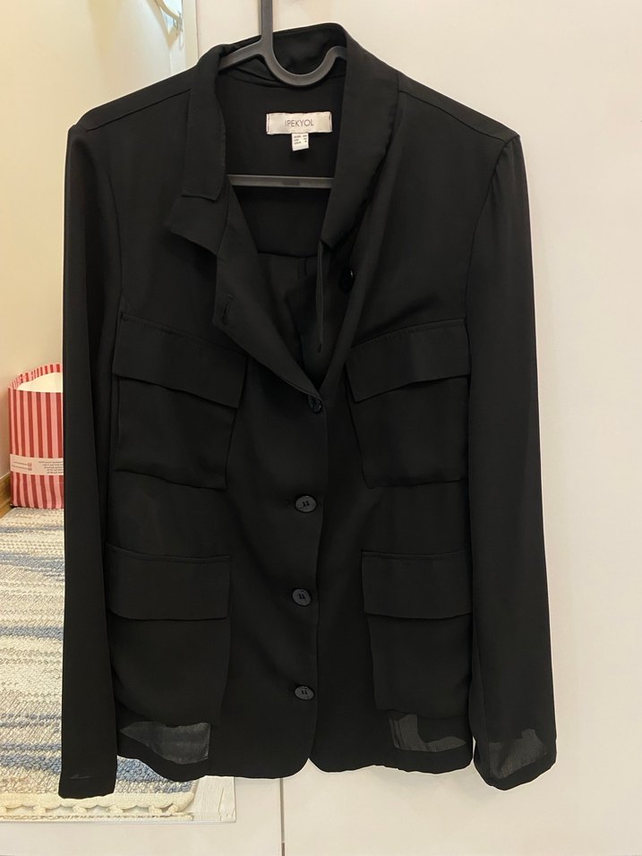 Düğmeli, siyah kadın blazer ceket ve gömlek olarak kullanılır normal kesim, uzun kollu ve ipeksi dokulu. 1 kez giydim XS-S uyumlu