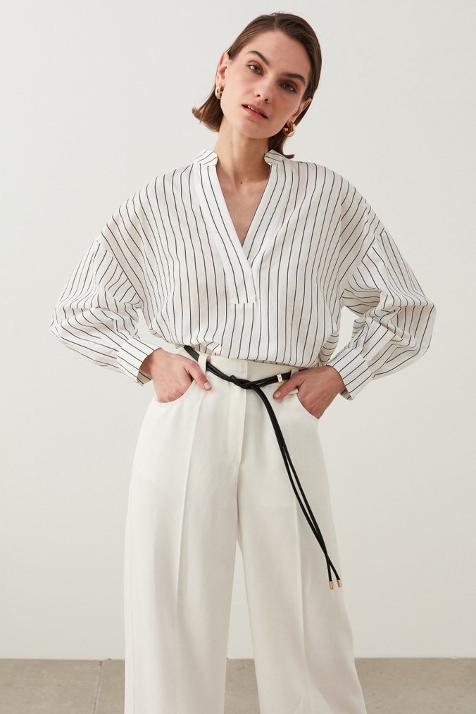 Basic formun konforlu ve şık duruşunu yansıtacan bir bluz. Çizgili deseni ve oversize kalıbı ile maskülen bir duruş kazandıran bluzu, denim ya da klasik kesim pantolonlarla kombinleyebilirsiniz.
