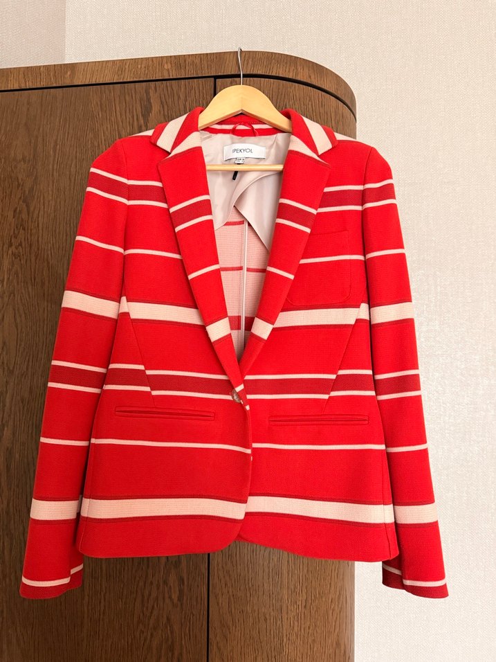 Renkli çizgili nar çiçeği kırmızı blazer, keskin yaka ve düğmeli ön detaylıdır. Normal kesim ve uzun kolludur, ofis için uygundur. 2 kez giyildi İki kolaltı 45 Boyu omuzdan 62 cm