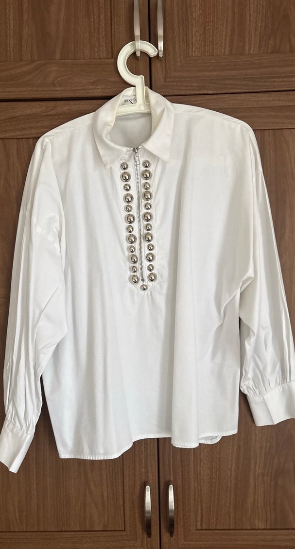 Düğmeli, beyaz pamuklu gömlek, yakalı ve uzun kollu, bol kesim. Ofis kullanımı için uygun. İki kol arası 55 cm omuzdan boyu 65 cm dir # gömlek #ipekyol