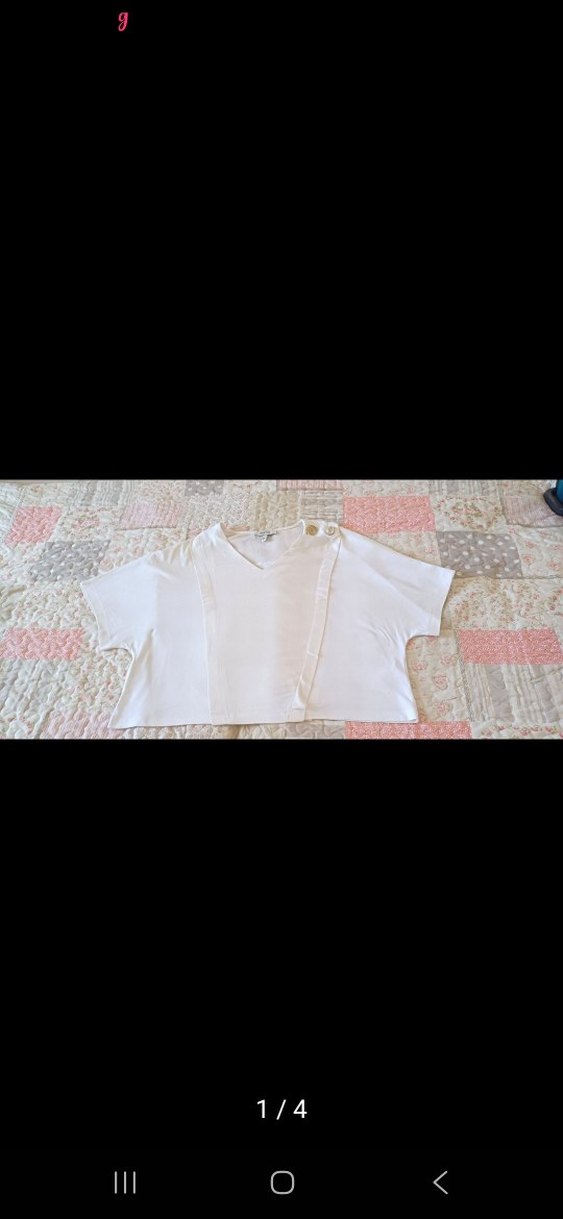 Yumuşak keten kumaştan, V yakalı, düğmeli, kısa kollu ve bol kesim beyaz hamile bluzu. Günlük kullanıma uygundur.