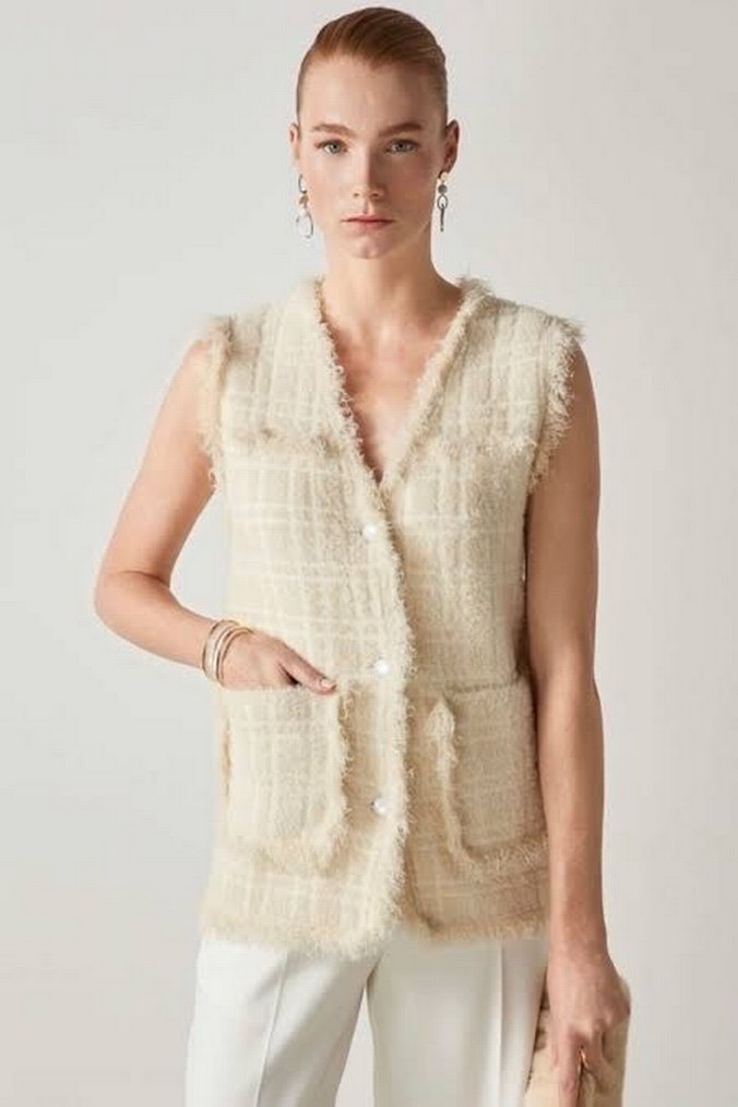 Bej renkte, yün kumaştan yapılmış, V yakalı regular fit kadın yelek.