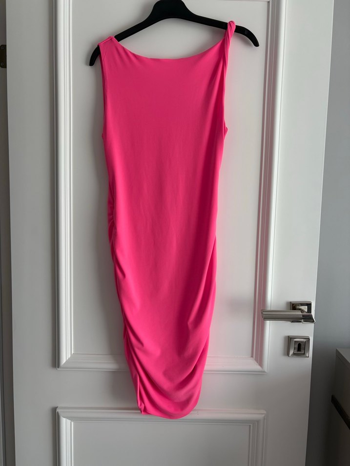 Pembe, drapeli ve V yakalı, pamuklu kumaştan yapılmış, kolsuz ve vücuda oturan ipekyol elbise Romantik akşamlar için uygundur. S beden 36 sorunsuz