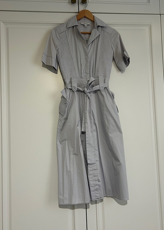34 beden .. 1,2 kere gıyıldı.. az kullanımlı cep detaylı hafif dız altı çan model belden kalın kuşaklı elbise .. 170cm boy, 48kg ile gıyıldı