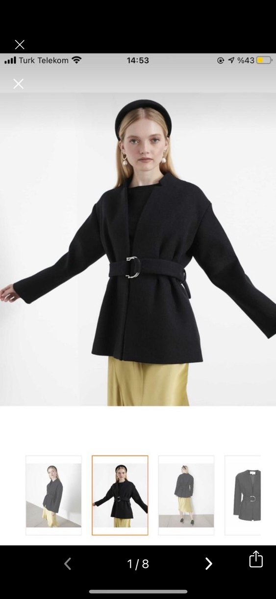 Bu siyah yün kaban kemerli bel ve uzun kollu olup, çağdaş minimalist tarzda, regular fit ve kısa boydadır. Ofis için uygun, yakasında kesikli yaka ve desensizdir.