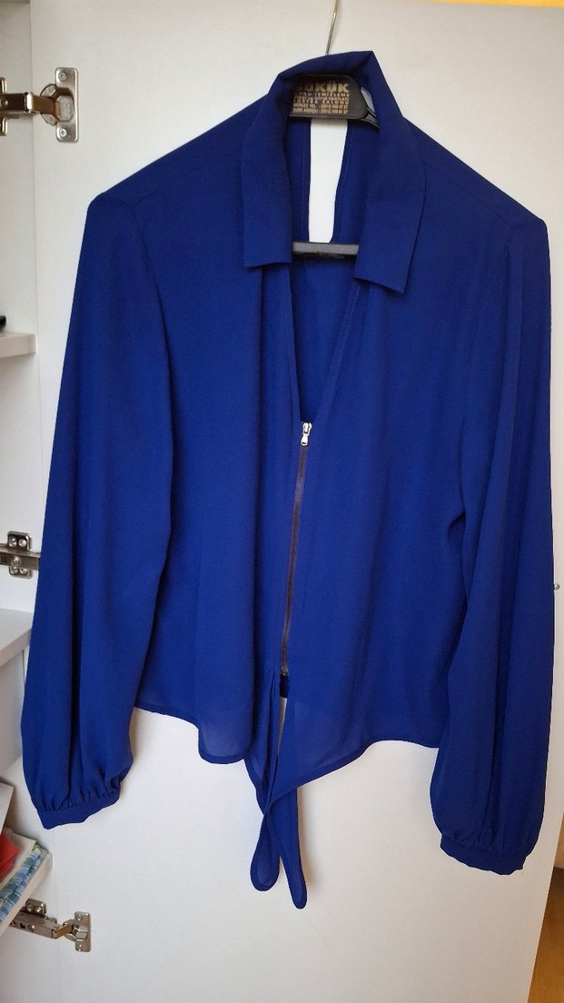 Uzun kollu, yakalı, fermuarlı mavi Bluz. Satenimsi kumaştan, parlak renkte, bol kesim ve midi boyda, ofis için uygun. İPEKYOL MARKA ÇOK ŞIK BLUZ ÖNDEN FERMUARLI VE KUŞAKLI 2 KERE 1 ER SAAT GİYDİM TERTEMİZ HİÇBİR DEFOSU YOKTUR