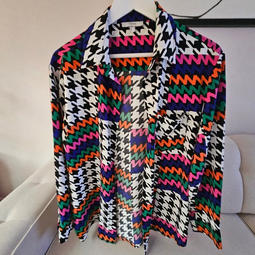 Renkli desenlere sahip, bol kesim ve uzun kollu kadın gömleği. V yaka ve düğmeli tasarımla bohem ve retro tarzını yansıtır.
