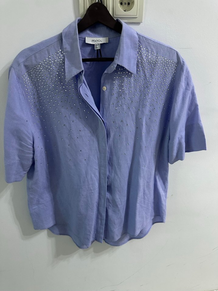 Kısa kollu, düğmeli, yakalı mavi keten gömlek. Salaş kesimi ve parlak detaylarıyla günlük sokak stiline uygun. Hiç kullanılmadı