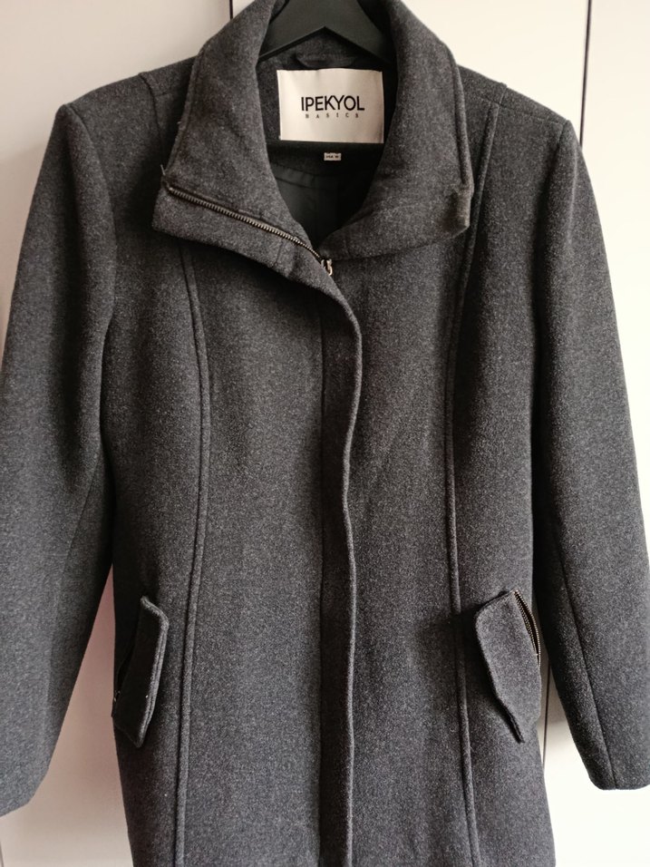 IPEKYOL gri kaban, yumuşak yün kumaştan üretilmiş, klasik tasarımlı, yüksek yakalı ve cep detaylıdır. Serin havalar için uygundur.