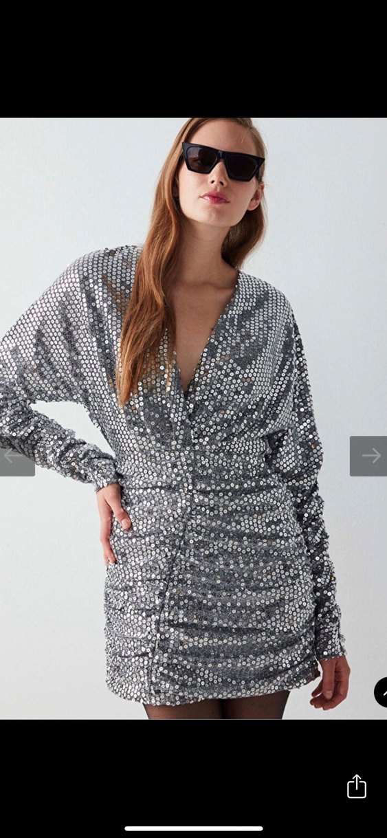 V yaka ve uzun kollu, payetli gri mini elbise. Sentetik kumaştan, yılan desenli ve modern tarzda, romantik buluşmalar için uygun. ✨