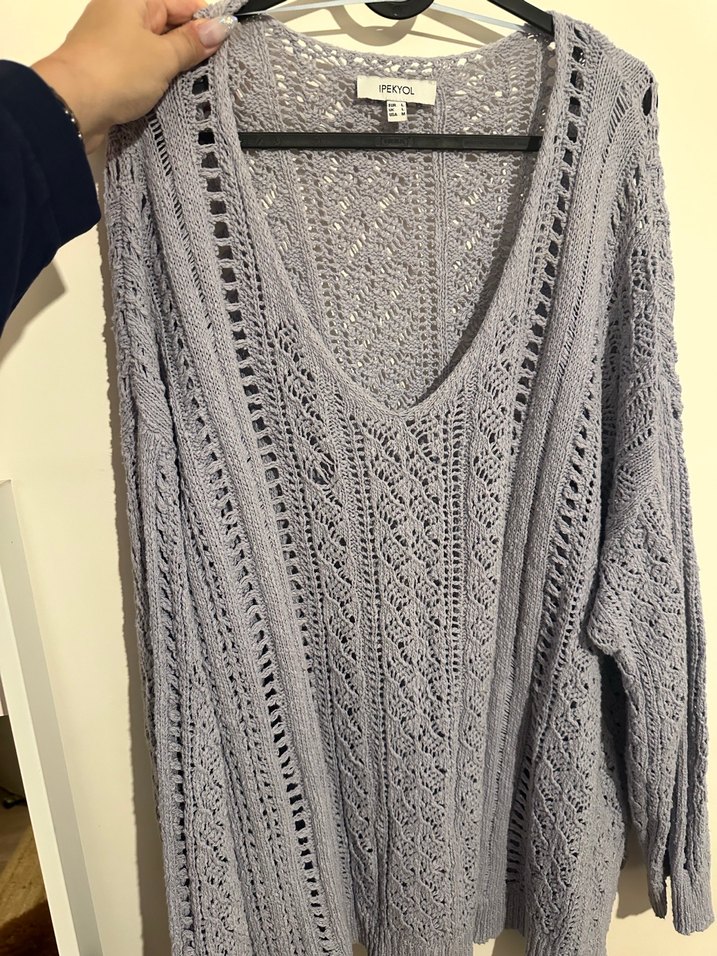 Gri renkli, örgü dokuma ve V yaka tasarımlı, bol kesim kadın triko. Yumuşak dokusu ve bohem tarzıyla günlük kullanım için uygundur. Taytların üstüne harikaaaa