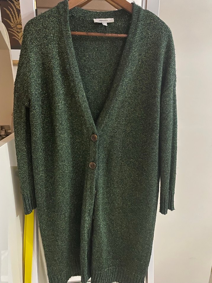 Uzun, örgü yün hırka, bol kesim ve yakalıdır. Yeşil renkte, desensiz ve günlük kullanım için uygundur.
