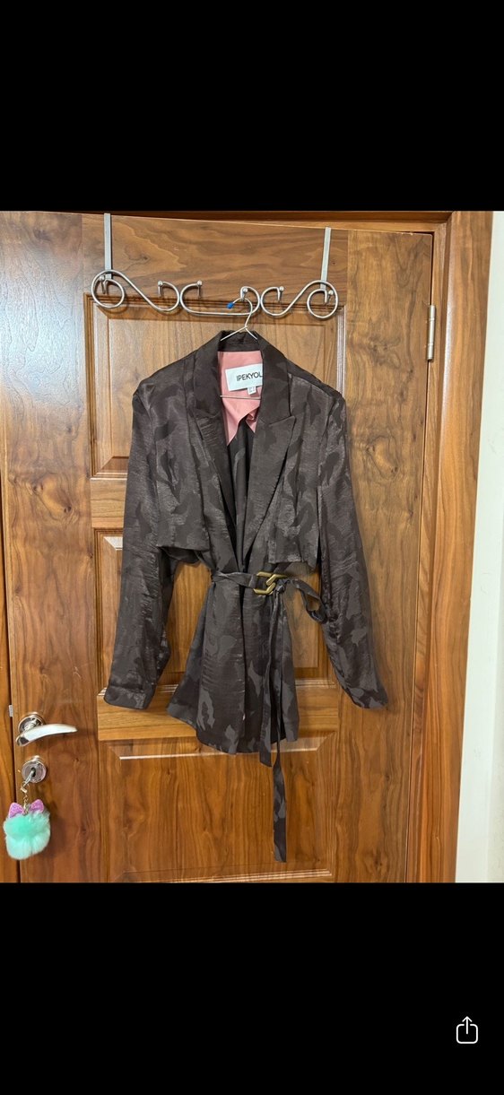 Kahverengi, ipeksi kumaştan yapılmış, uzun kesim, kuşaklı ve yakalı kadın blazer. Bağlamalı kolları ve batik desenleri ile dikkat çekiyor. Üst 40, alt 38 beden. Sayılı giyildi