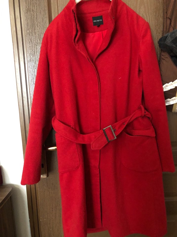 Kırmızı kadın kaban, kemerli ve büyük ceplidir. Yumuşak ve sıcak kumaştan, yüksek yakalı ve gizli ön kapamalıdır. tüylenmeler var fiyatı uygun buyüzden kuru temizlemede çıkar ama