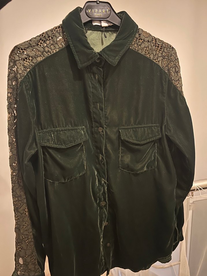 Bu koyu yeşil süet gömlek, düğmeli ön kısmı, uzun kolları ve kesik yakası ile bol kesimdir. Desenli yapısı romantik buluşmalar için uygundur.