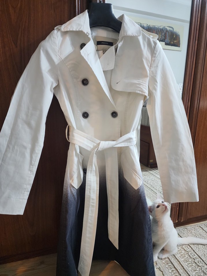 Uzun beyaz pamuk trençkot, kuşaklı ve kesik yaka detaylıdır. Gri ton geçişli, regular fit ve askılı kolludur, sokak modasına uygundur.