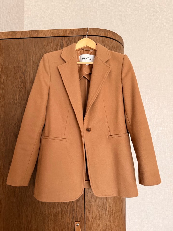 Yumuşak yünden yapılmış, camel düğmeli ve uzun kollu kadın blazer ceket. Ofis için uygun, normal kesim ve notched yaka detaylı. Çok az giyildi, omuzdan boyu 70 cm