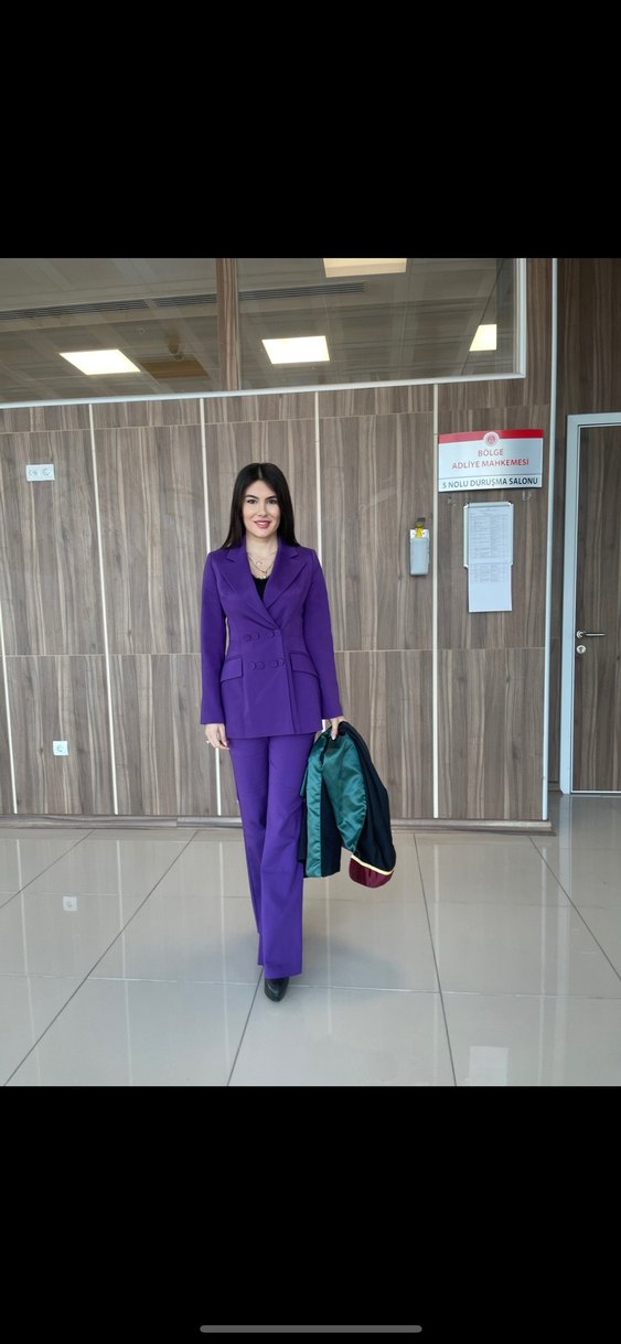 Kadınlar için parlak mor renkte, normal boy midi uzunluğunda, kemerli ve uzun kollu takım elbise. Notch yakalı, sentetik kumaştan, iş ortamına uygun şık ve rahat bir model. 34 bedendir bir kez giyildi