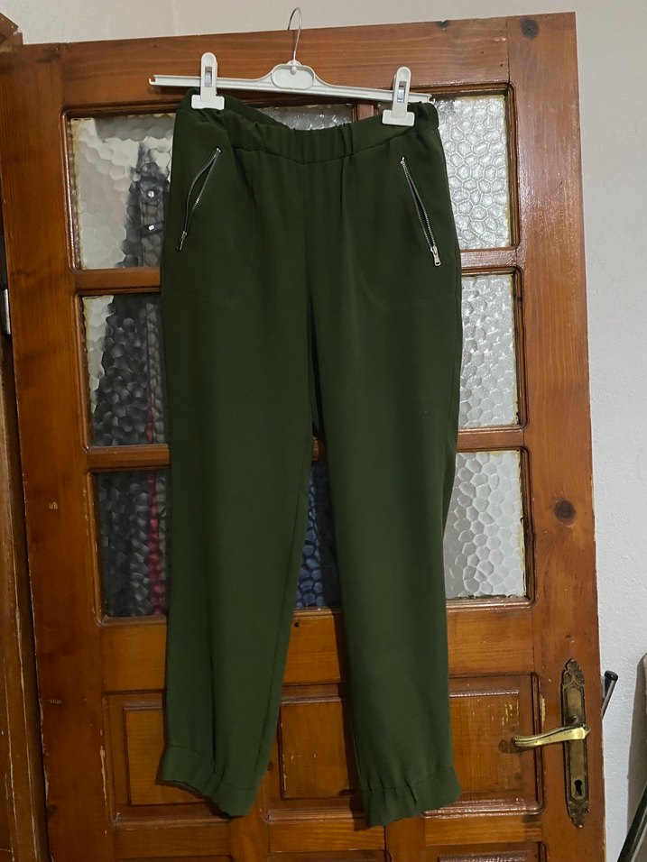 Kadınlar için koyu haki renk, rahat kesim ve fermuarlı ceplere sahip midi boy sentetik kumaş pantolon. Ofis ve günlük kullanıma uygundur. Defosu son fotoğrafta belirtilmiştir.