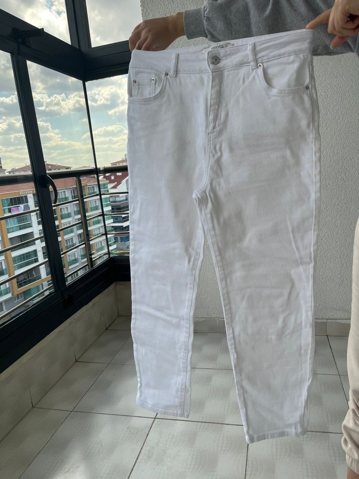 Pamuklu, regular fit, beyaz midi uzunlukta kadın kot pantolon. Günlük kullanıma uygun, rahat ve şık sokak modası tarzında.